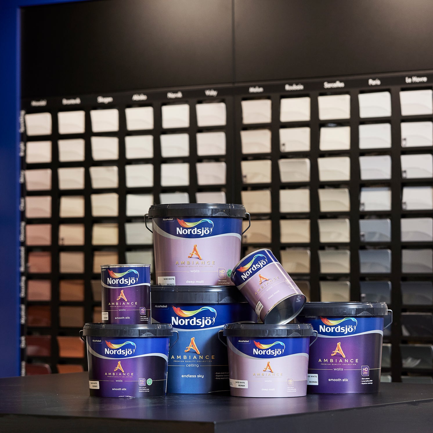 Kulörerna i butikens utvalda har vi skapat med hjälp av produkter från Nordsjös Ambiance-serie. Till väggar rekommenderar vi Ambiance Deep Matt som ger en helmatt vacker yta som samtidigt är tålig. Snickerier blir vackra i Ambiance Superfinish som ger en hållbar och reptålig yta för både snickerier och möbler inomhus.