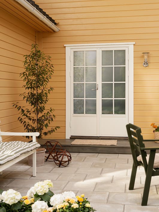 En gul kulör bör dra lite åt rött. Risken är annars att fasaden ger ett grönaktigt intryck. Se upp med klara nyanser, eftersom gula fasadfärger lätt upplevs som för starka och nästan självlysande. För att få en behaglig gul nyans som fungerar på en fasad bör färgen upplevas som lite murrig och ”smutsig” på färgprovet. Svartheten är också viktig för att färgen inte ska bli för stark när den målas på en stor yta och ses i dagsljus. Till gula hus rekommenderas gulbruna, grå, mörkbruna eller rödbruna fönster och detaljer.